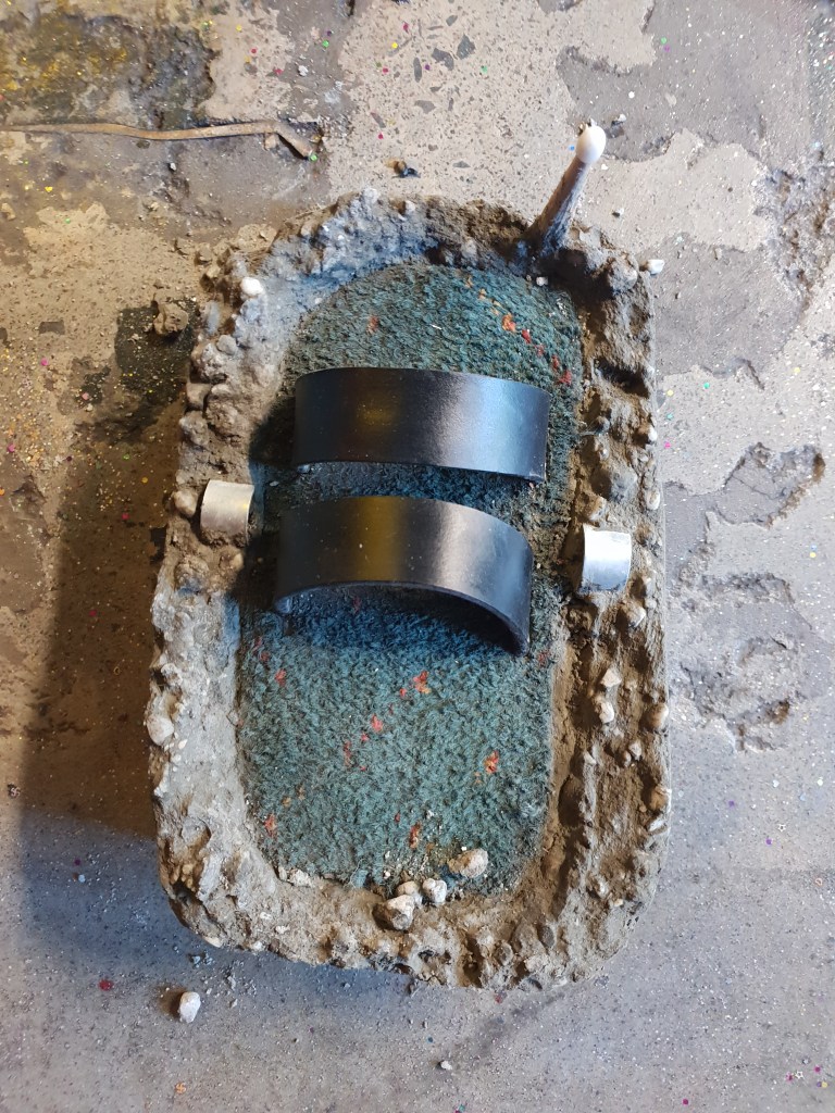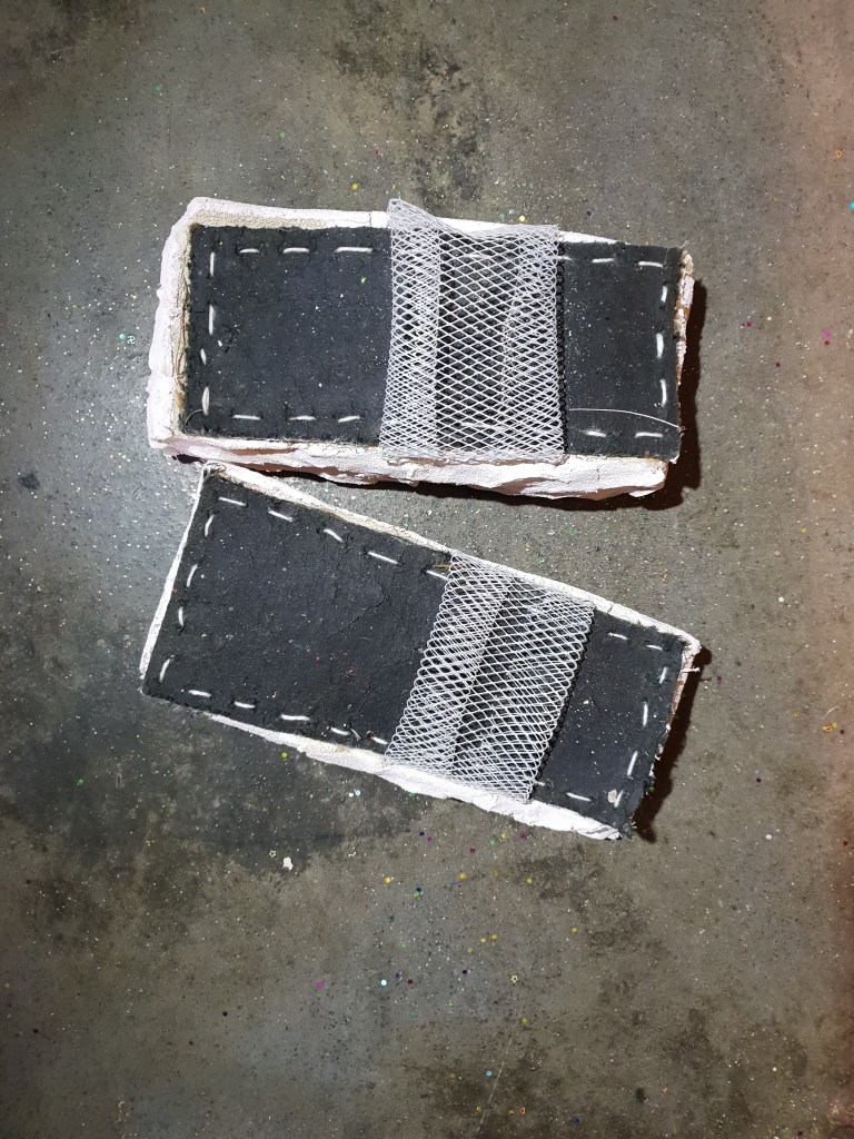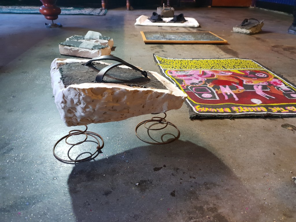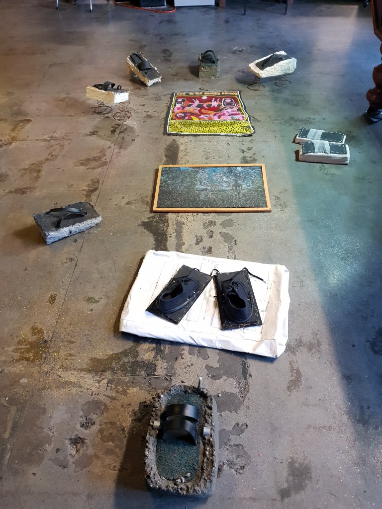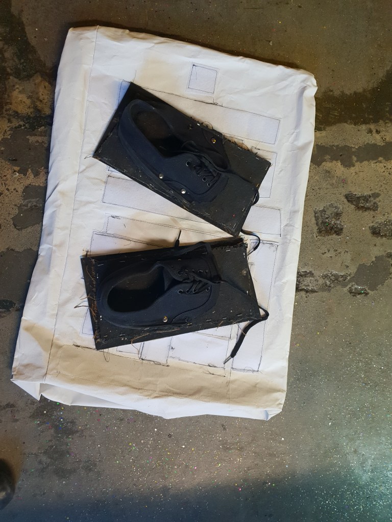 When the sticky carpet got ripped up from the Brisbane Hotel band room, Gibbo the publican suggested a carp-art exhibition. Panels of the carpet were given to local artists to play with. I made some power of nostalgia shoes.