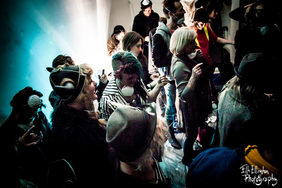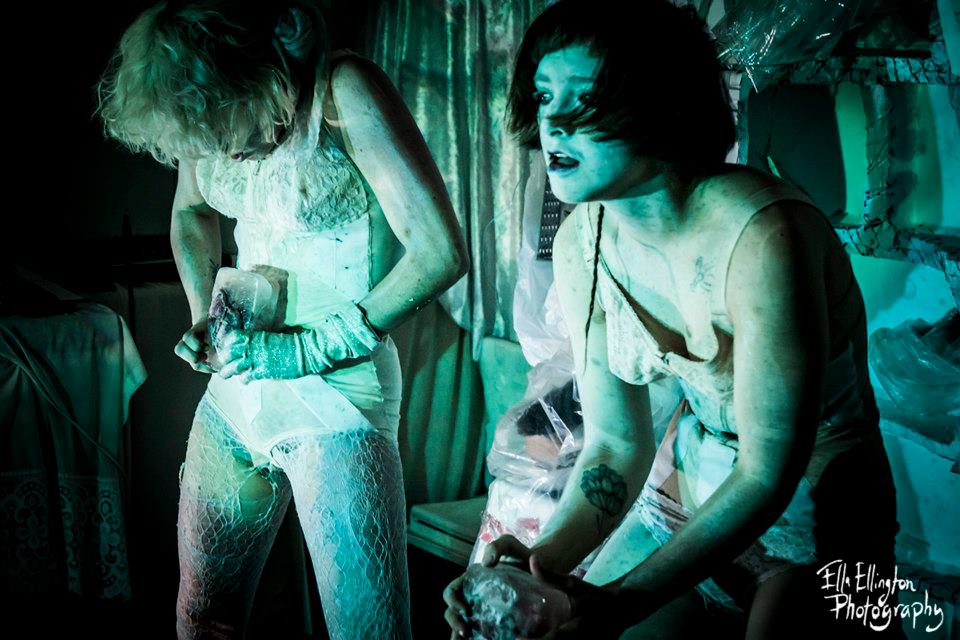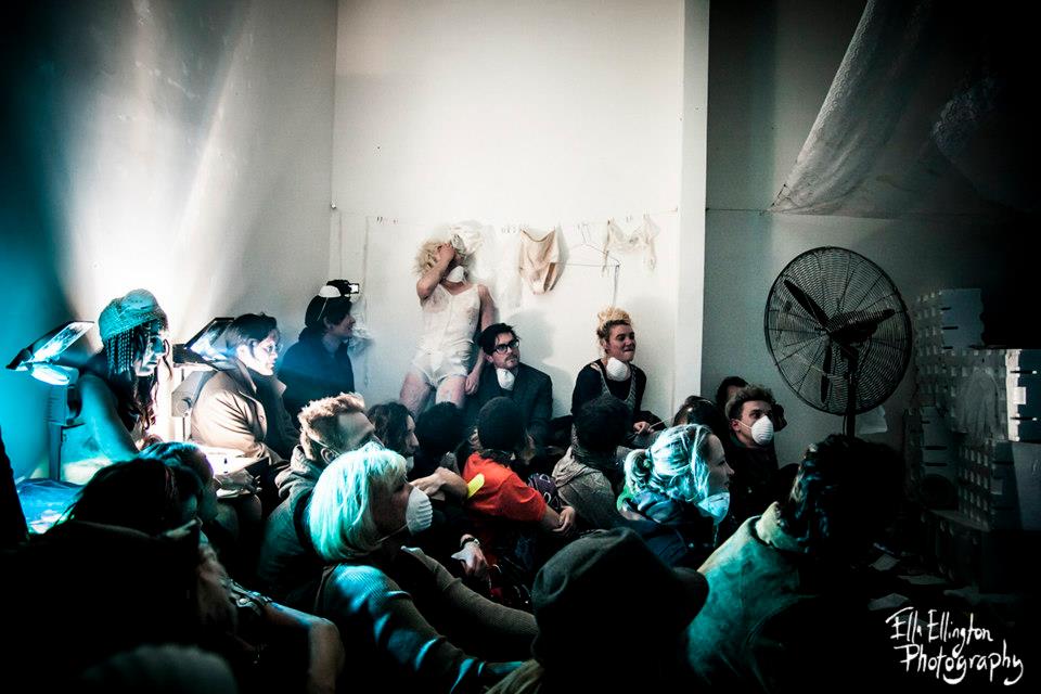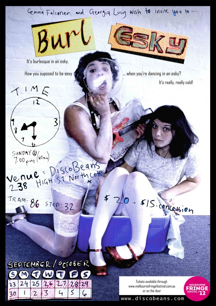 Eventually the project underwent months of further creative development. Squatting in a Brunswick warehouse, the pair made use of the abundance of styrofoam boxes that would form their trademark set. Burlesky explored ice-o-lation from a post apocalyptic frozen over bunker where if you were too cool to dance you were going to die.
