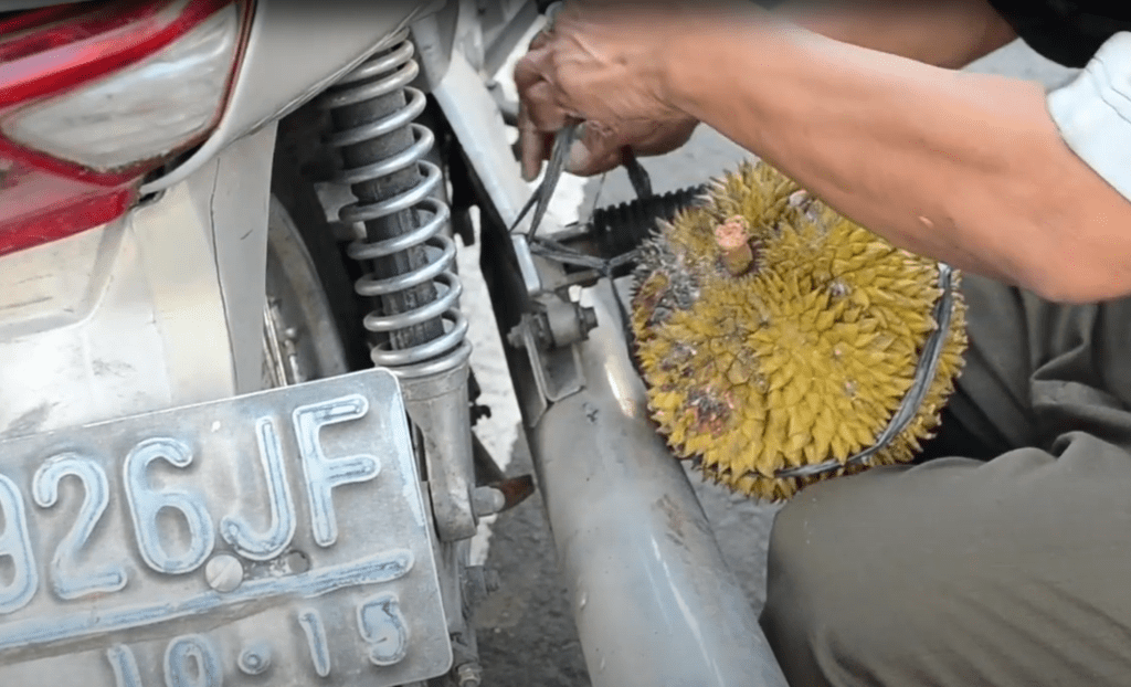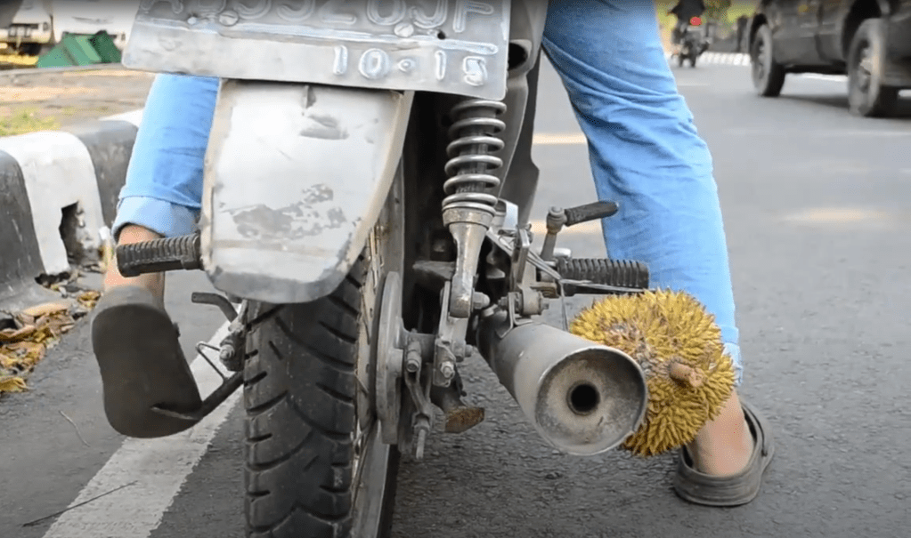 Cooking Durian is a video work created from a residency in Yogyakarta in 2014. Named in some regions as the “king of fruits”, the durian is distinctive for its large size, strong odour, and thorn-covered rind. Hanging on the streets by the fruit pasar markets, I noticed this stinky fruit might become stinkier by adjusting the position for transportation from a conventional carrying situation to one which involves rigging the load to the muffler on a motorbike. I became a provocateur agent coaxing customers and stall holders of the durian to engage. I also partook in the act. Where ever I rode my motorbike, the muffler heated the fruit and a stench trail of cooked up durian followed. A mobile fart bomb service. I collaborated with Indonesian friends Hana Resila and Ahmad Afandi to capture the Durian footage. This video was exhibited at constance ARI Hobart.