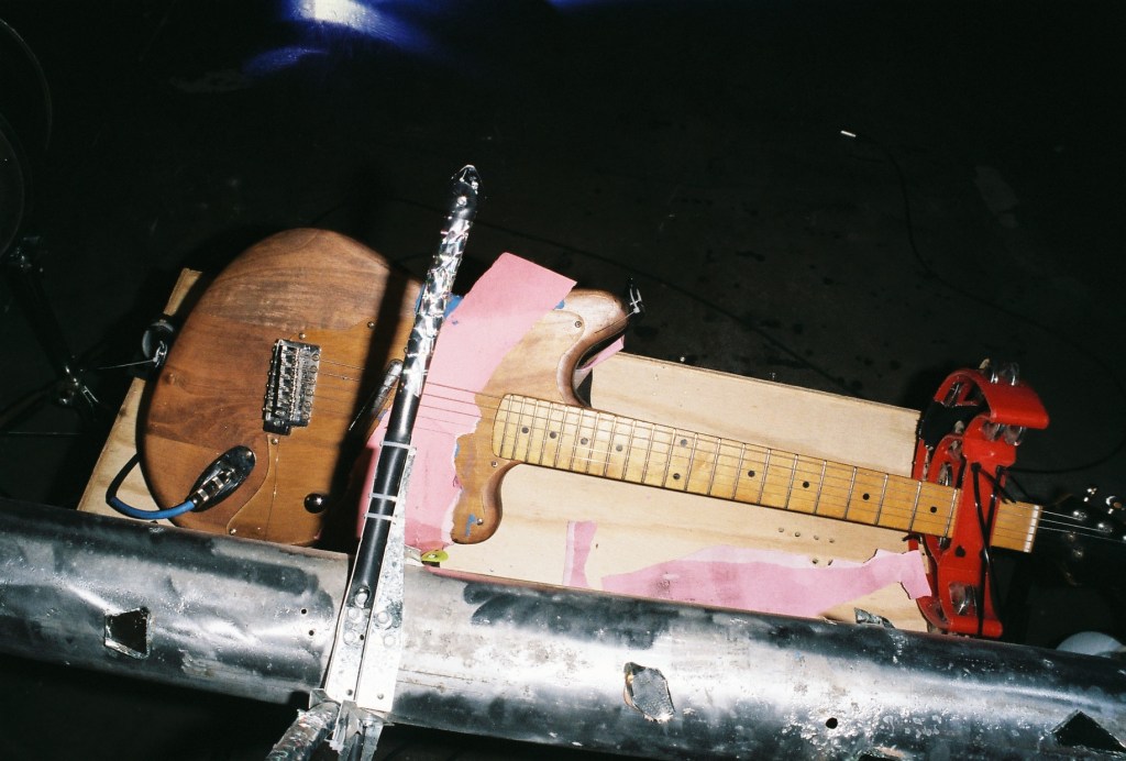 A musical performance with a handmade drum machine. A 5-meter-long pool lane roller, brackets, rods, drumsticks, guitar picks. A drum kit. A guitar. A guitar amp.