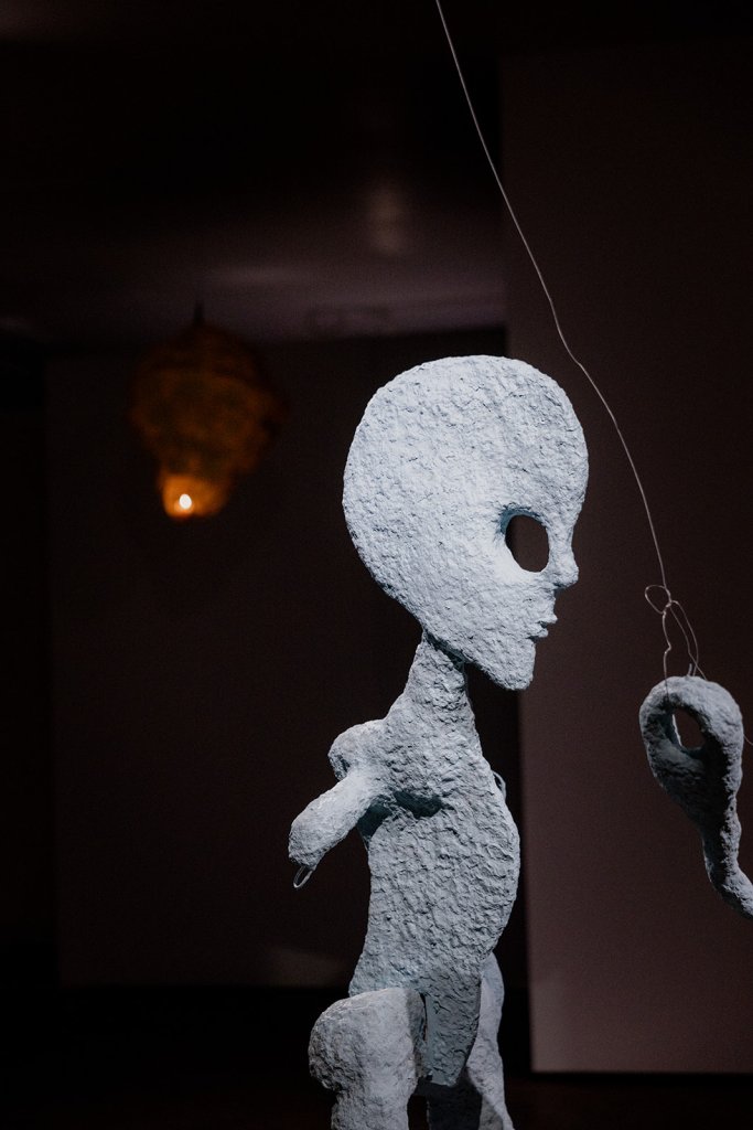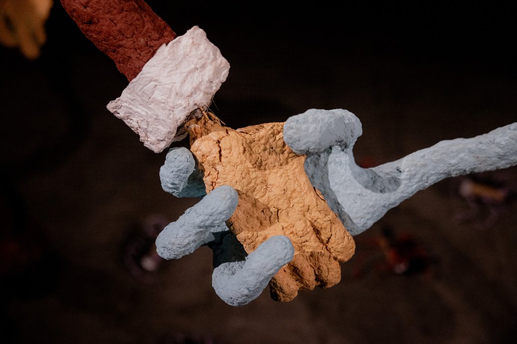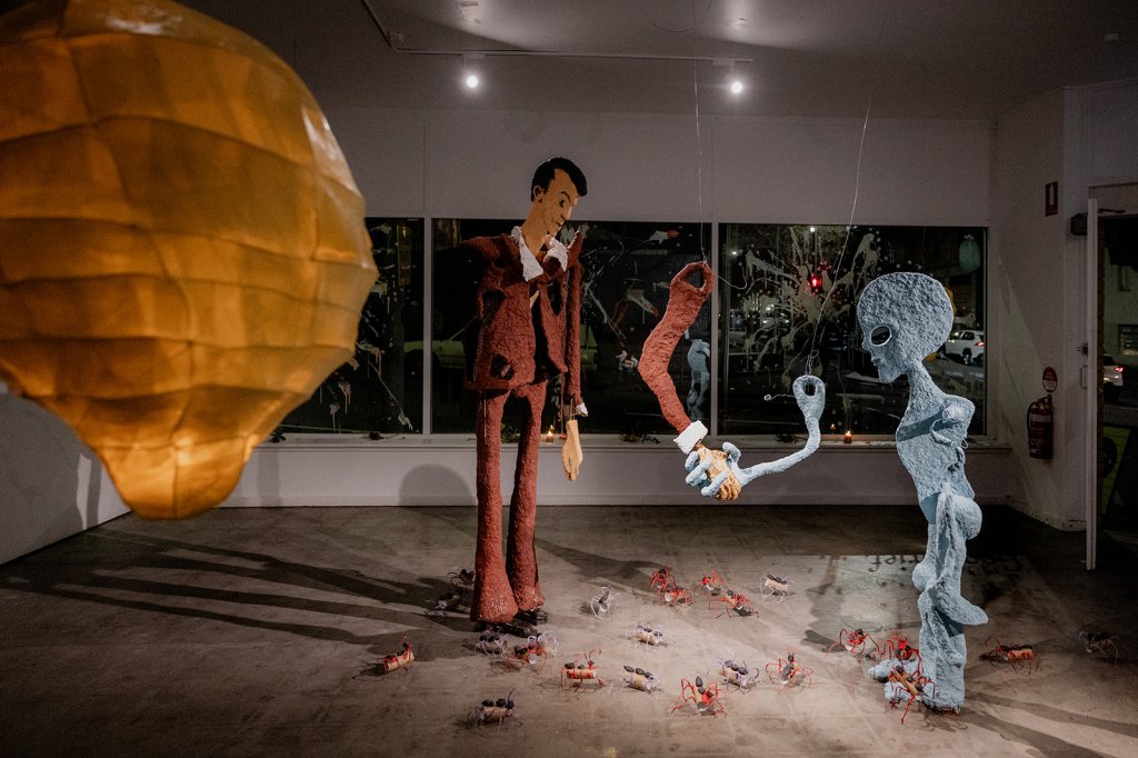 Another unusual aspect of VAD is that you get to choose your exit outfit. Dad opted for his fav shirt, a band shirt he got from the op shop. The band is called Helmet, and the cartoon image on the shirt is of a man in a brown suit shaking hands with a tiny green alien. Doing a deal of some kind. An agreement. An arrangement. An attire to say the least. I rendered this tee image into paper machete statues as a sort of salute to the situation.