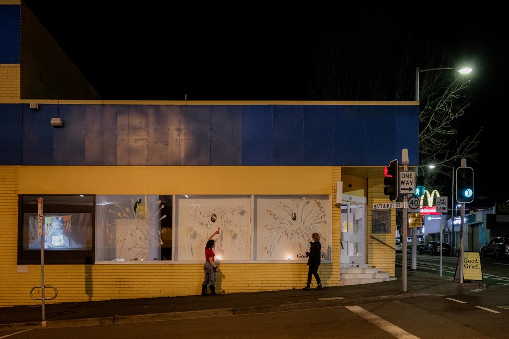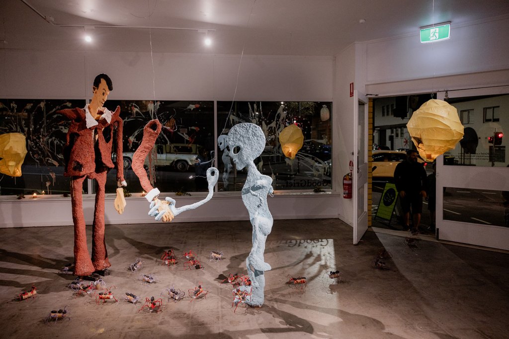 The parade went from gallery to the carpark through a human tunnel. Those bloody Ingalls performed a special song on the back of Chris’ ute and Good Grief artists Lych and Wes, simulating fireworks, twirled fire sticks and even breathed flame. Then Brother Pat fed everyone Dad’s famous curried sausages served with homemade chutney. Yum.
