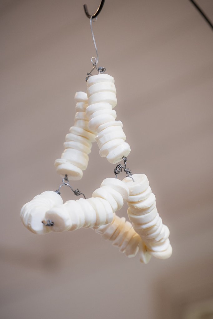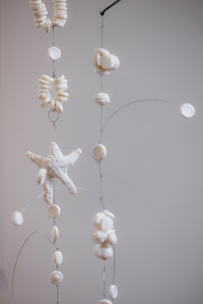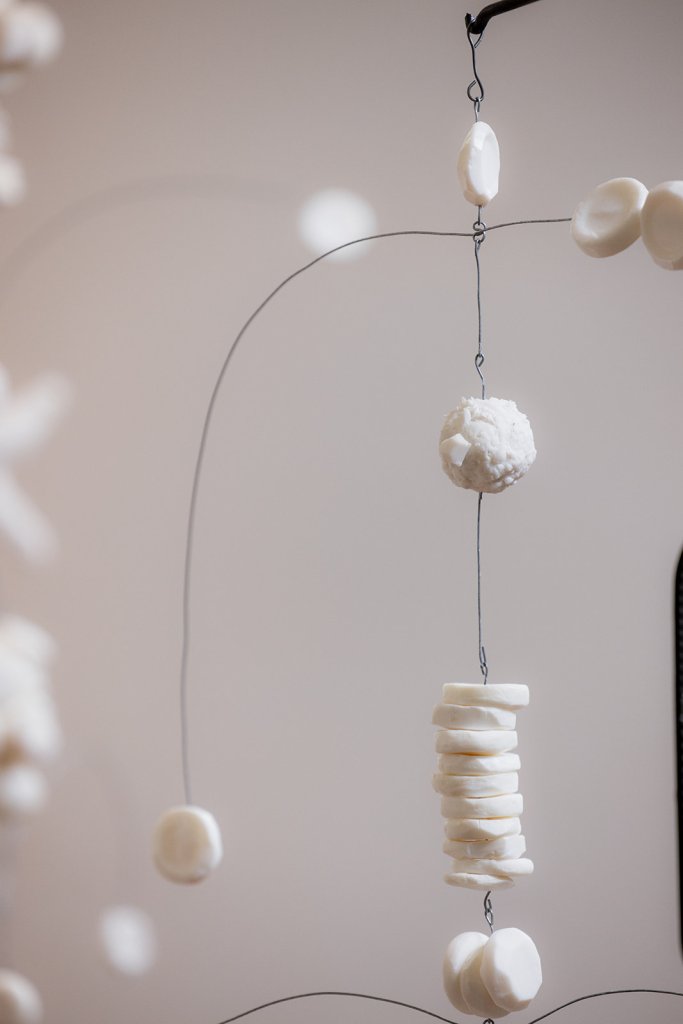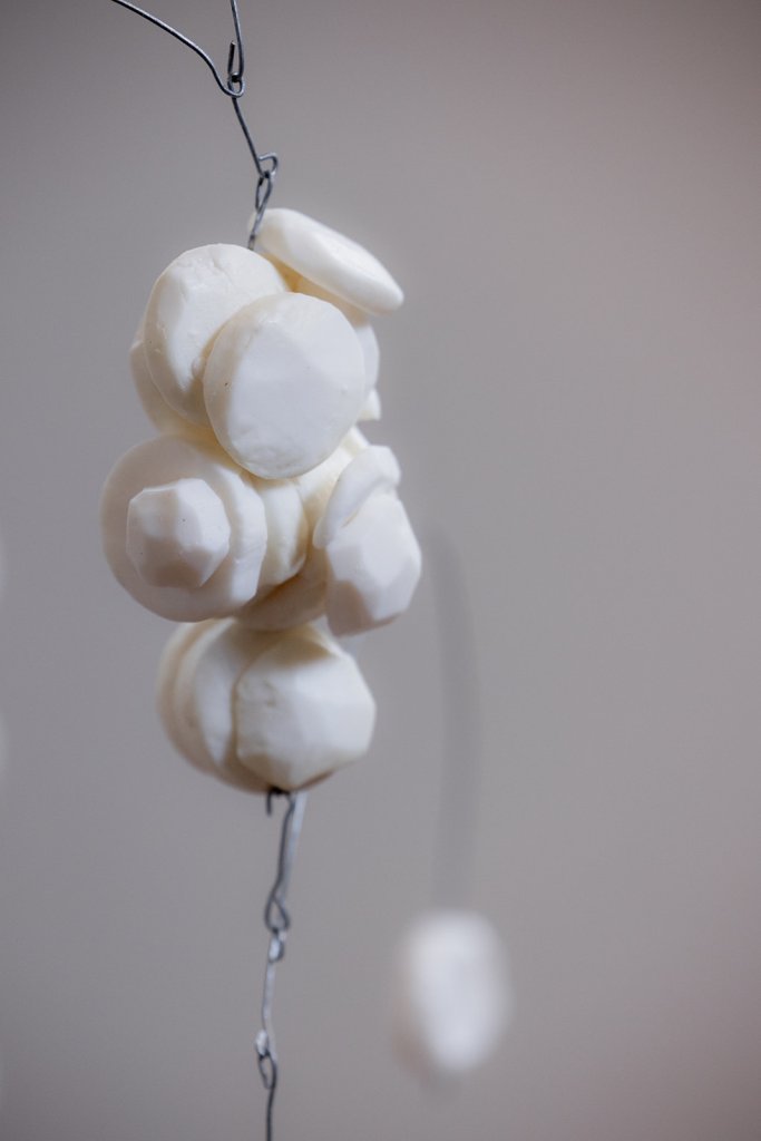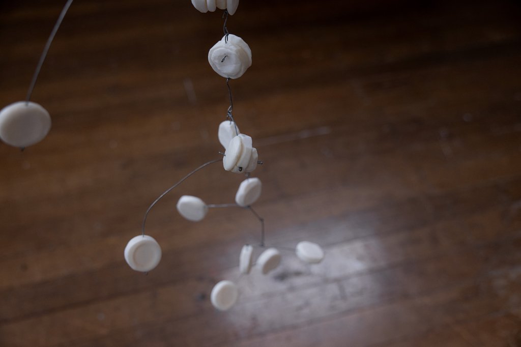 Moving in the room, Soap Stars’ first iteration took the form of a suspended mobile. It was a balancing act, much like balancing art with my day-job. I often try to bridge these worlds, using the monotony of repetitive work to meditate on artistic quandaries. Sometimes it fails. The mobile fell spectacularly at the opening; a collapsed constellation, a big bang.