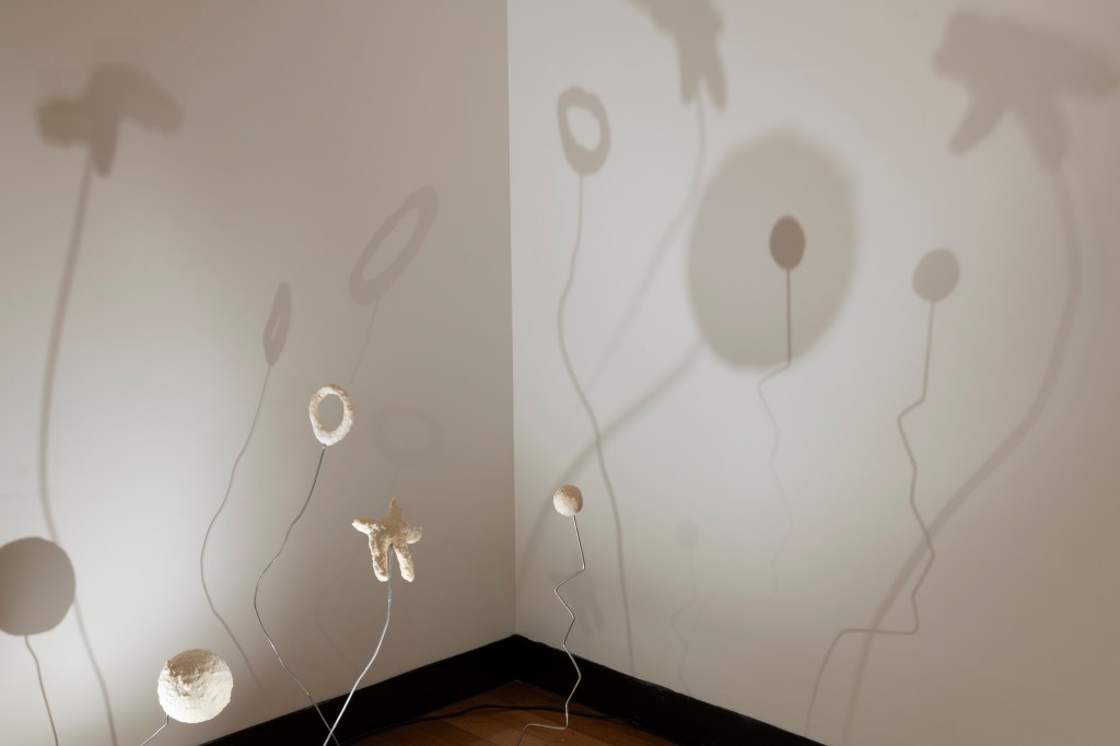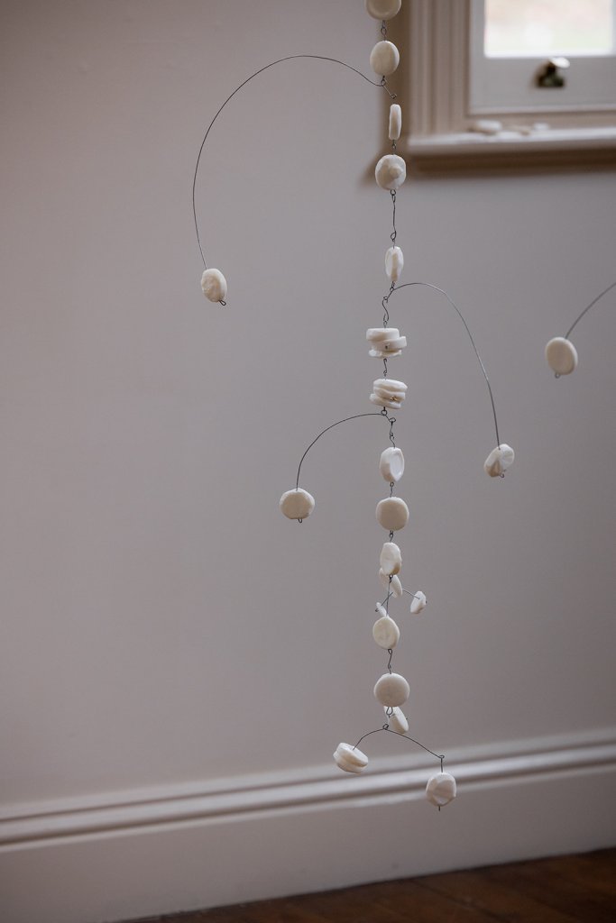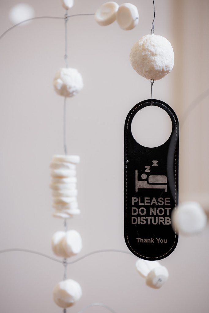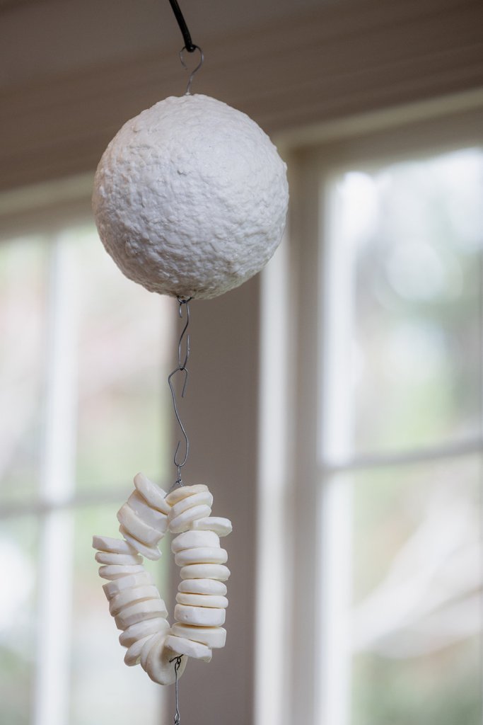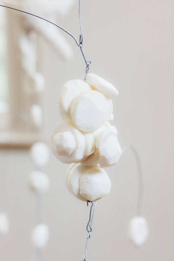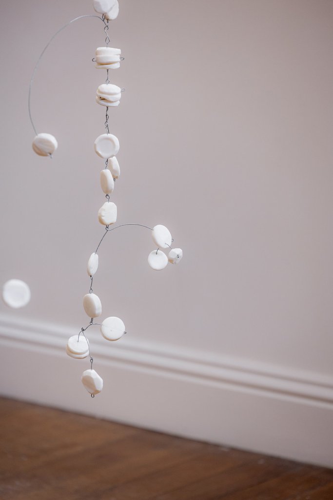 Moving in the room, Soap Stars’ first iteration took the form of a suspended mobile. It was a balancing act, much like balancing art with my day-job. I often try to bridge these worlds, using the monotony of repetitive work to meditate on artistic quandaries. Sometimes it fails. The mobile fell spectacularly at the opening; a collapsed constellation, a big bang.